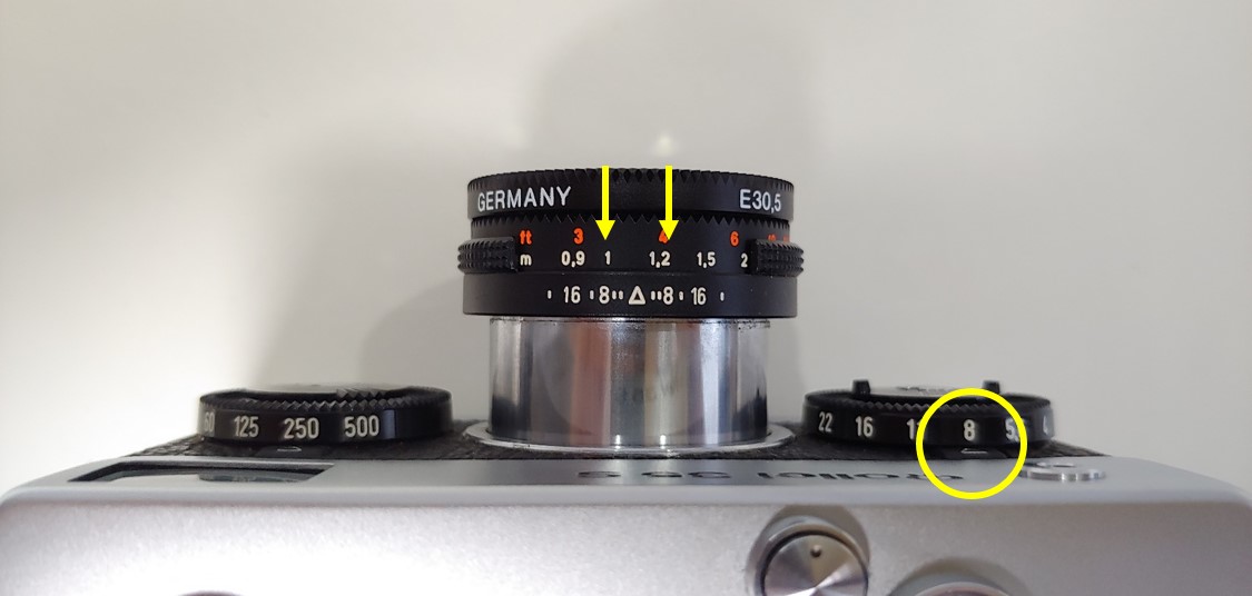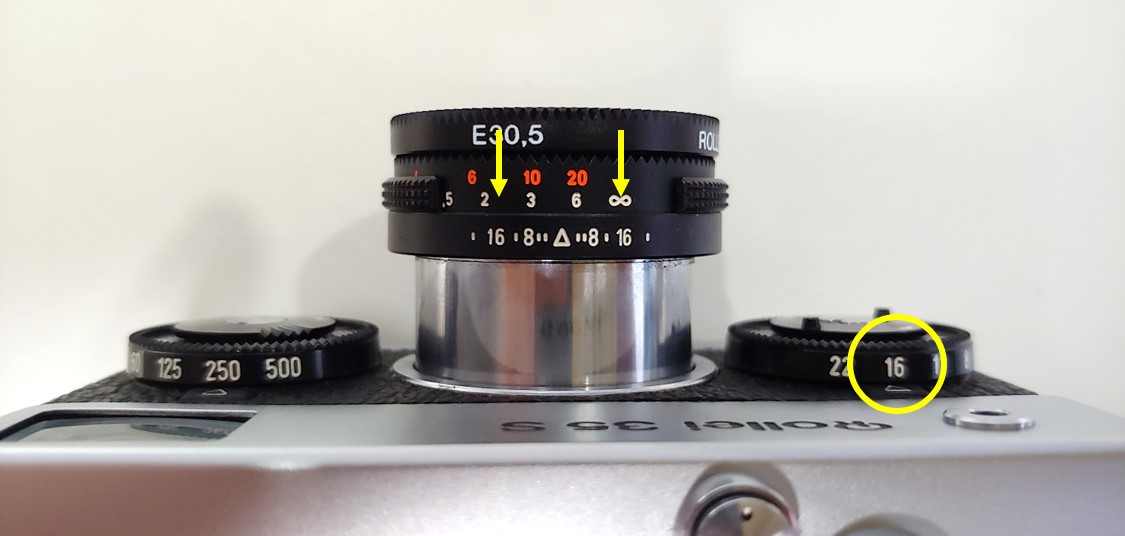 롤라이35 렌즈 경통에 나타난 숫자들을 보자. 16이 두 개, 8도 두 개... 쌔하다. 이 숫자들은 왠지 내가 맞춰둔 조리개를 나타내는 것 같다. 이 부분은 움직이지 않고 고정돼 있으니 가만 냅두자. 그 앞쪽에 거리(0.9, 1, 1.2, 1.5, 2, 3, 6, 무한대)가 표시된 부분이 포커스링이다. 얘를 돌려서... 무한대 기호가 오른쪽 16에 오도록 하면 위 그림처럼 대략 2쩜 몇미터(왼쪽 숫자16이 가리키게 되는 거리)부터 별나라까지의 zone에 들어온 모든 피사체들은 focus가 맞게 찍힌다.