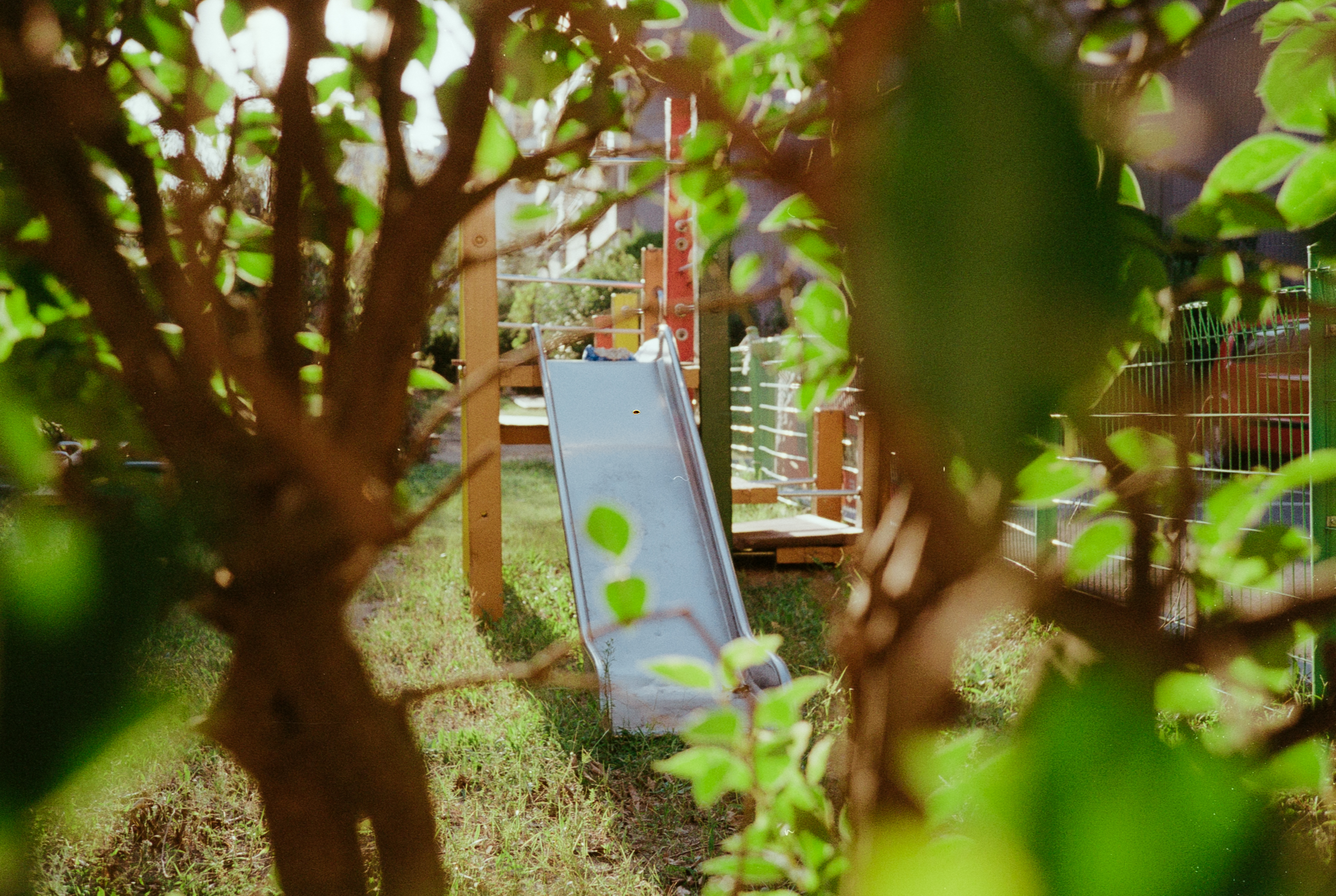 약 5m 떨어진 미끄럼틀을 찍으면서, 앞쪽에 액자처럼 프레임에 들어오는 전경(피사체보다 가까이 놓인 경치)을 흐리게 나타내 보자. 3m보다 가까운 거리를 포커스 존에서 제외하면 된다. 미끄럼틀은 존에 들어오면서 기왕이면 나뭇잎들이 더 확실히 흐려지도록, 왼쪽 숫자8이 대략 4m까지 되도록 포커스링을 돌려줬다. 이 존을 벗어나 앞에 있는 것들은 가까우면 가까울수록 아웃포커스 될 것이다.