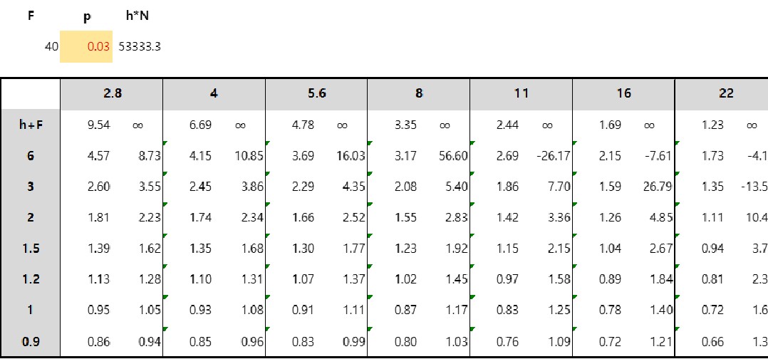 롤라이 나름의 기준으로 만들어진 포커스 존 표는 소개한 적이 있으니, 이번에는 허용착란원 0.03을 적용해 직접 표를 만들어보면 대략 다음과 같다. 간단히 비교해보면, 역시 롤라이에서 만든 표가 더 깐깐한 기준에서 태어난 것임을 확인할 수 있다. 즉, 더 정확하고 선명하게 맞은 초점이라야 '롤라이 기준'을 통과할 수 있다.
