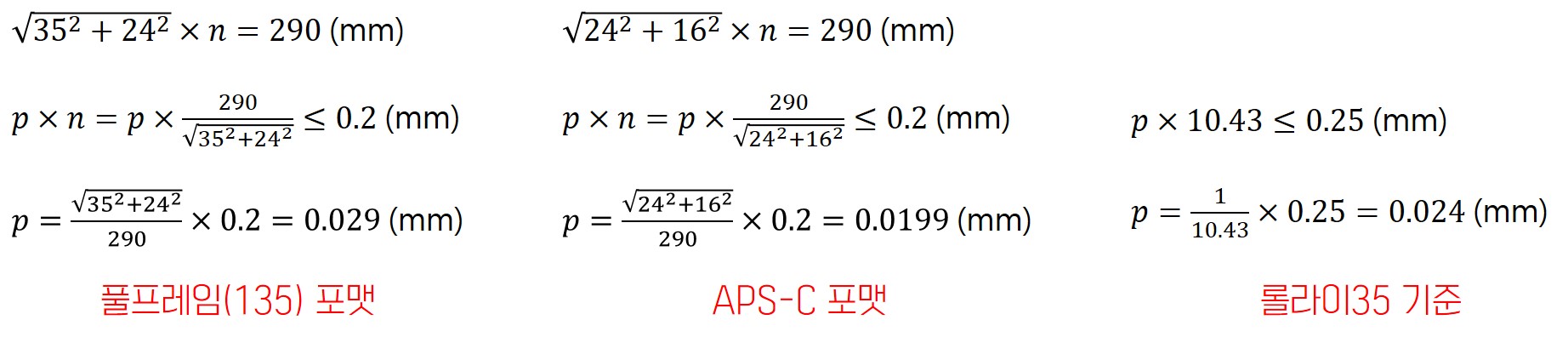 허용착란원의 일반적인 기준은 풀프레임 규격에서 0.03, APS-C 규격에서 0.018이라고 알려져 있다. 물론, 촬상면 위에서 측정한 착란원의 한계 지름(mm)을 의미한다. 이보다 작은 모든 착란원을 사람은, '점'으로밖에 인식하지 못한다. 왜 하필 이 숫자들일까. 대체 어디에서 튀어나온 걸까. 이 부분의 논의는 또다른 티스토리 블로그 '럽의 세상담기'의 내용을 전적으로 참고한 것임을 미리 밝혀둔다.