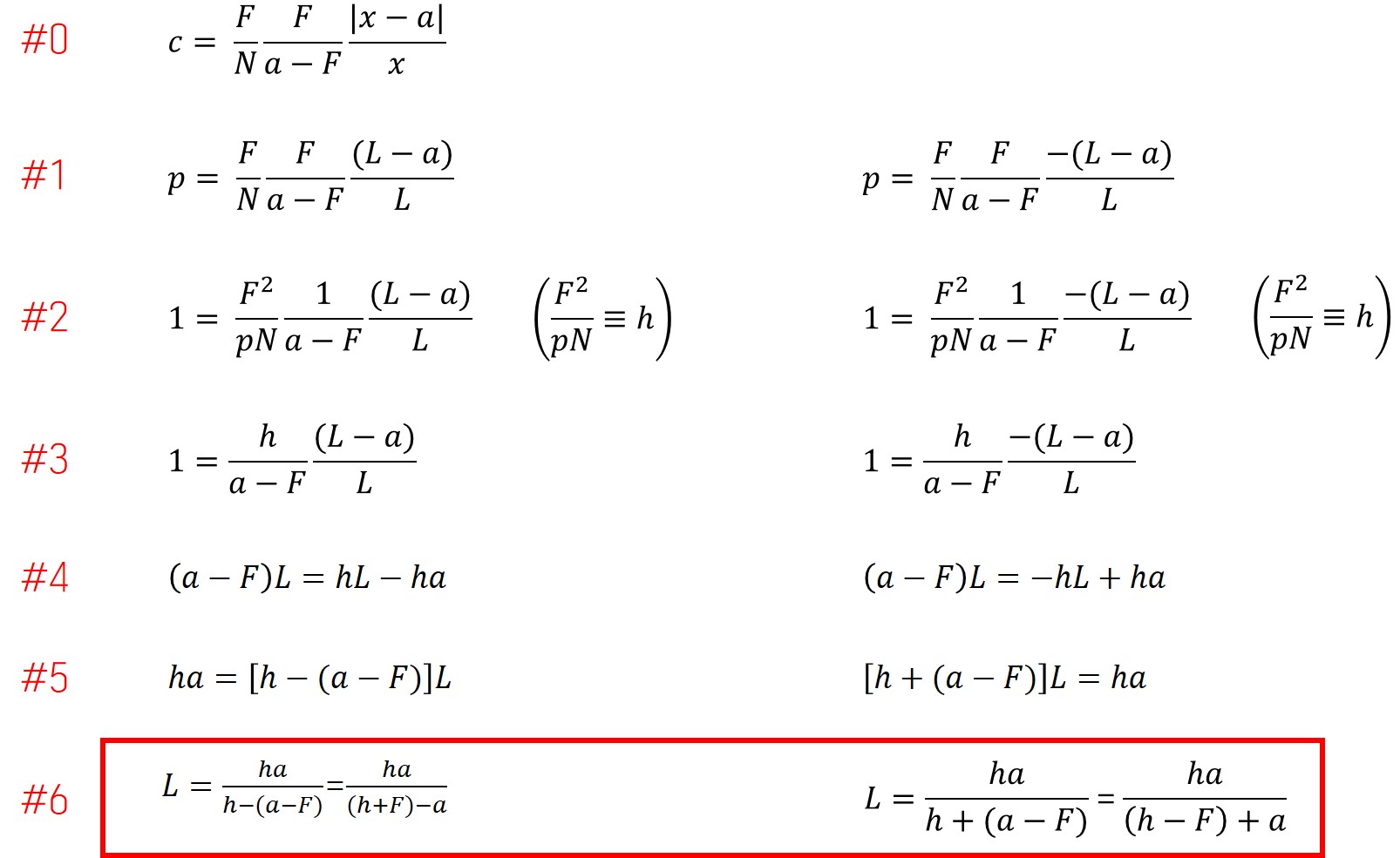 촬상면에 생기는 착란원의 크기 c는 초점거리(F)와 조리개(N), 초점을 겨냥한 거리(a)와 다른 배경의 거리(x)에 의해 결정된다고 소개한 적이 있다(#0). 전경의 경우는 피사체보다 가깝기 때문에 x-a가 음수가 되는데, 그렇다 하더라도 착란원의 크기는 0보다 작을 수 없기 때문에 절댓값 기호가 필요하다. 지난 포스팅에서 이 값들을 대입했던 것처럼 F=F, N=N, a=a, x=L일 때 착란원의 지름이 p라고 해보자(#1). 이 p가 점이라고 인정해줄 수 있는 최대 크기, 즉 허용착란원이라면, L은 아마도 피사계 심도의 끝점 중 하나가 될 수밖에 없다. L이 a보다 크면 L-a로 계산하고(왼쪽), L이 a보다 작은 경우(전경)에는 a-L로 계산해주면(오른쪽) 결과를 항상 양수로 만들어줄 수 있다. 그래서 언제나 가까운 L과 먼 L 두 가지 경우가 발생하게 된다. 지금부터 L을 구해보도록 하자.