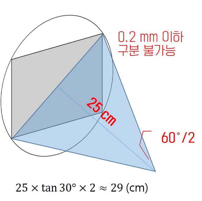 그렇게 했을 때 우리 눈의 화각이 약 60도라는 점을 기억하자. 나도 정확히는 모른다. 그렇다고 한다. 이런 상황이라면 25cm 떨어진 지름 29cm의 동그란 영역을 관찰하는 것이 우리 시력의 최선이라고 할 수 있다. 우리 시야의 원 내부에 집어넣고 볼 수 있는 가장 큰 사진이라면 대각선 길이가 역시 29cm라야 한다는 결론이다. 카메라 내부에서 상이 맺히는 촬상면은 분명 이 사진과 닮은 직사각형일 것이다. 그 대각선 길이 사이의 비율을 알면, 사진에서 우리가 '점'으로 인정해주는 최대 크기의 원이, 확대 인화되기 전 필름에서는 어느 정도 사이즈였는지를 알아낼 수 있다.