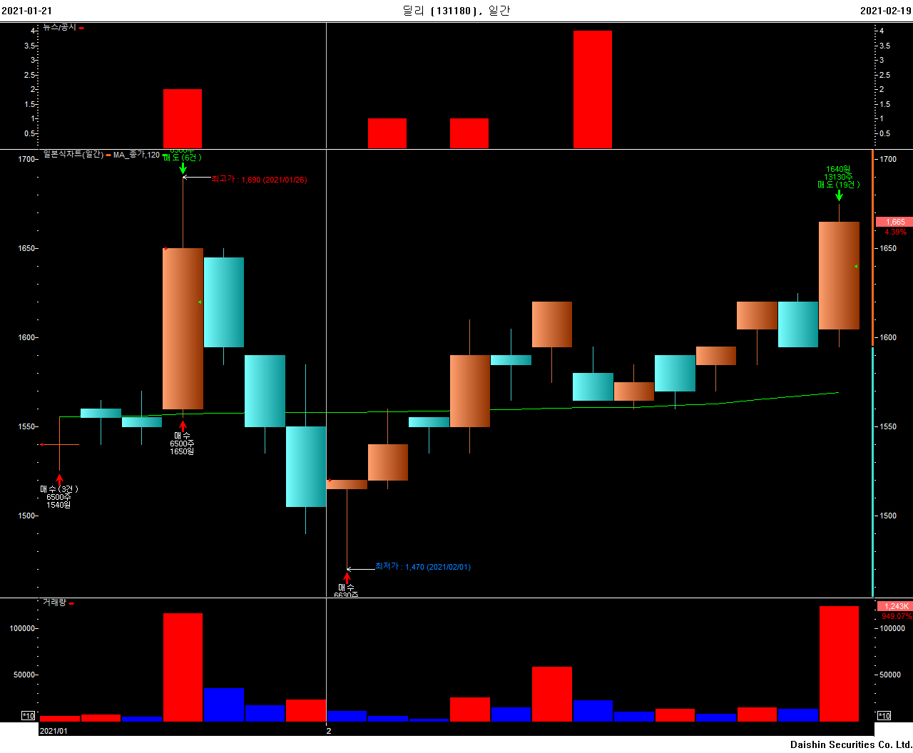 팔았던 날 종가에 다시 매수했다. 목표가에 갈 때까지 120 이평선을 기준으로 매수매도를 반복할 계획이었다. 이후 장이 조금 수그러들어 딜리의 주가도 120일 아래로 내려왔다. 매수 기준에 들어온 거기 때문에 똑같은 금액을 종가에 더 부었다. 평균단가가 1584 즈음에 맞추어졌다. 이제는 상승장도 아니어서 2%만 목표수익률로 잡았다. 매일 아침 1640원에 매도를 걸어 두었는데 12 거래일만에 체결이 된 것 같다.